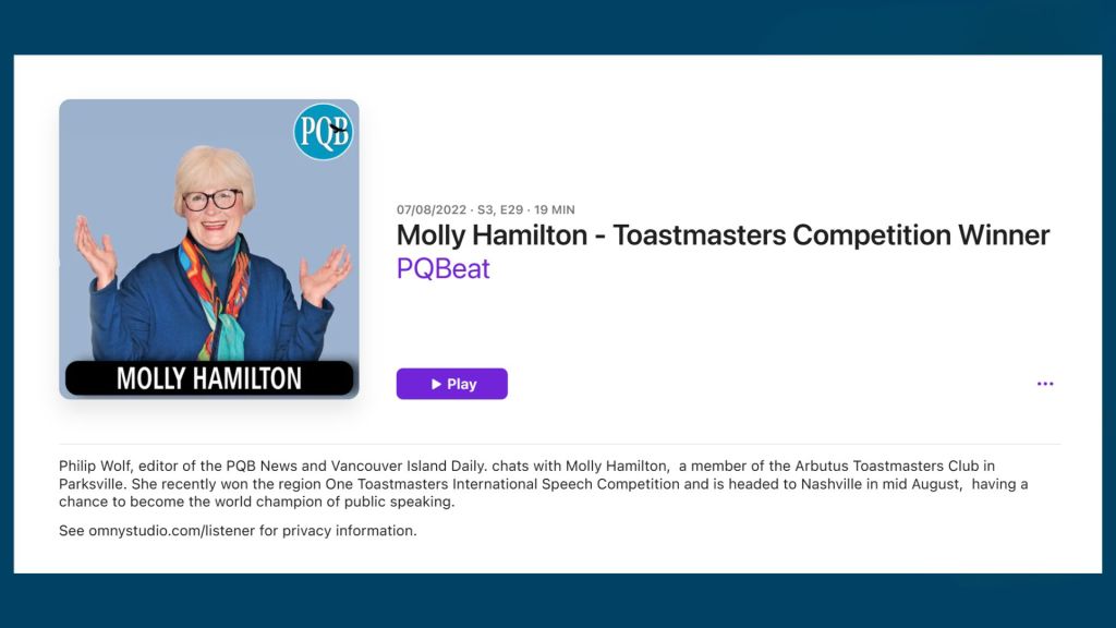 Interview with Parksville Qualicum Beech “PQBeat Podcasts” re upcoming Toastmasters Championship of Public Speaking contest – July 8, 2022