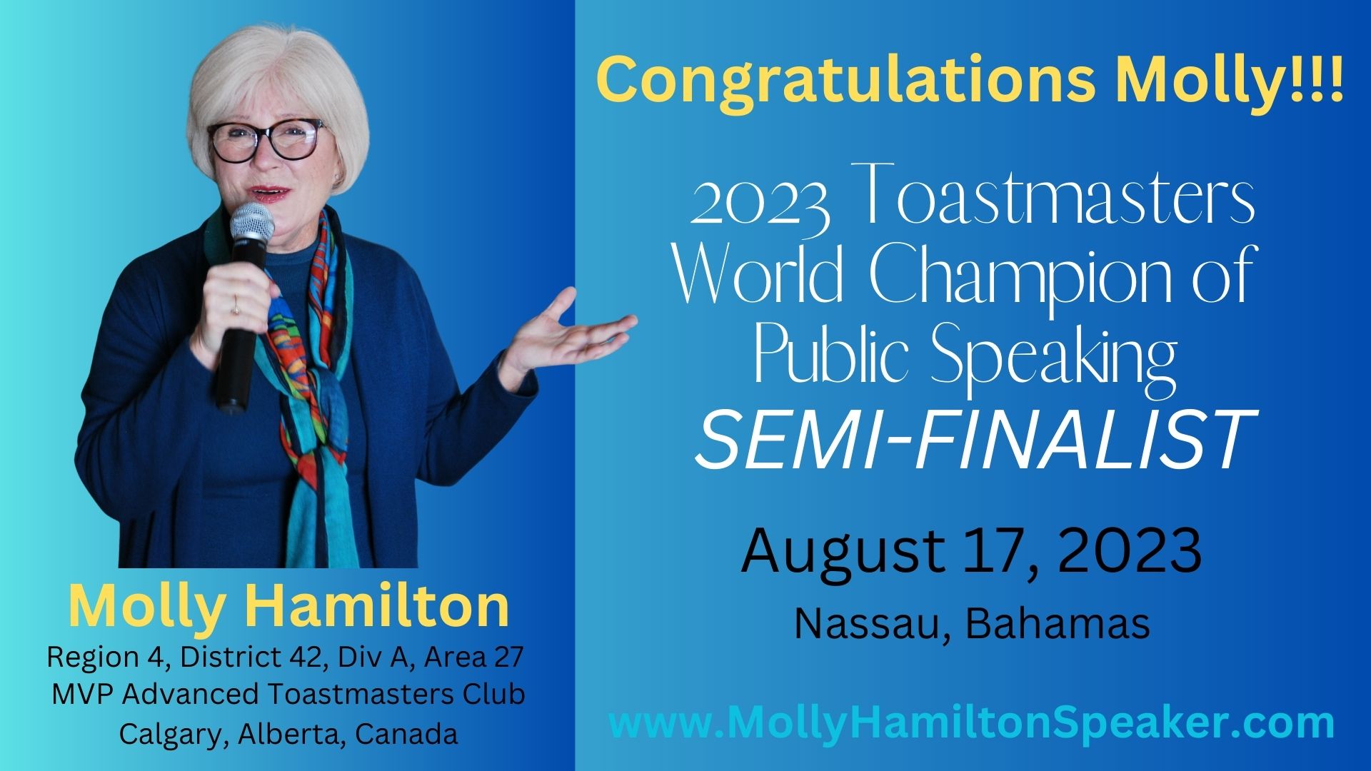 Molly Hamilton, is a Semi-Finalist in the 2023 World Championship of Public Speaking. The Toastmasters International Speech Contest Semifinals lead up to the World Championship of Public Speaking®, the highest level of competition at Toastmasters. Each year, over 33,000 Toastmasters from over 143 countries, battle for the title of World Champion of Public Speaking. This year, the months-long competition culminates at the 2023 International Convention, hosted in Nassau, Bahamas, as 28 semi-finalists compete for a title that can transform lives. To arrive at the Semi-Finals, participants have advanced through five levels of competition. It begins at the club level and proceeds through the Area, Division, District, and Region quarterfinal. Molly will be one of two people representing Region 4 at this years Semi-Finals. event held on August 17th in Nassau, Bahamas. The contest will take place as part of the hybrid International Convention running August 16 – August 19, 2023. The top two contestants from each semi-final contest will advance to the World Championship of Public Speaking Final round on August 19th, for a chance to become the 2023 World Champion of Public Speaking.