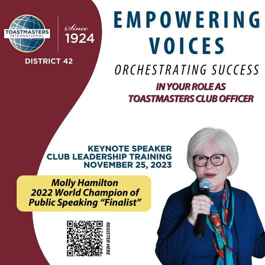 Join us for an inspiring keynote by Molly Hamilton, 2023 Toastmasters World Champion of Public Speaking Semi-Finalist! In “Empowering Voices, Orchestrating Success,” Molly will empower Club Officers to maximize their potential and drive success as club leaders. Don’t miss this opportunity to elevate your leadership journey in Toastmasters!