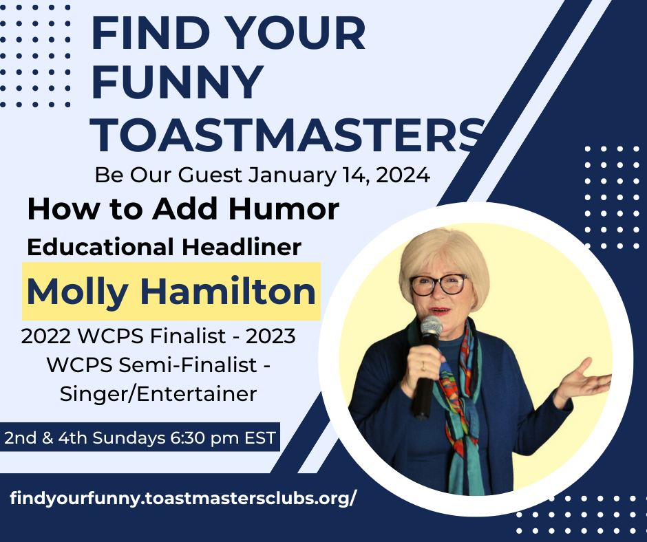 Throughout this presentation, you’ll explore the nuances of humor in public speaking, dissect the anatomy of the speech entitled “Stuck with a Problem” that garnered me 1st place in the 2023 Toastmasters District 42 Humorous Speech contest, and equip yourself with the tools to add wit and charm to your delivery. From witty one-liners to clever anecdotes, you’ll cover it all. You can be our guest on Sunday, January 14, 2024, 6:30-8:00 p.m. EST, Florida. Go to our website and fill out the interest survey to get the Zoom link: https://findyourfunny.toastmastersclubs.org