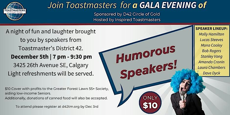 Hosted by Inspired Toastmasters, and sponsored by Circle of Gold, this will be an evening of hilarity, jocularity and fellowship, meant to remind us all what a fabulous IN PERSON event can do for the Toastmaster soul! EIGHT of the funniest speakers in District 42! Molly Hamilton, Lucas Steeves, Mona Cooley, Bob Rogers, Stanley Vong, Amanda Cronin, Laura Chambers, and Dave Dyck. MC’d by professional speaker and former Toastmaster, Palmo Carpino. Included in the evening will be a ceremony recognizing our District 42 Toastmasters with 40+ years of membership. Lots of free parking. You must register for this event. Tickets will be sold at the door. $10. Doors open at 6:15 pm. Cover with profits to the Greater Forest Lawn 55+ Society, aiding low-income Seniors. Additionally, donations of canned food will also be accepted.