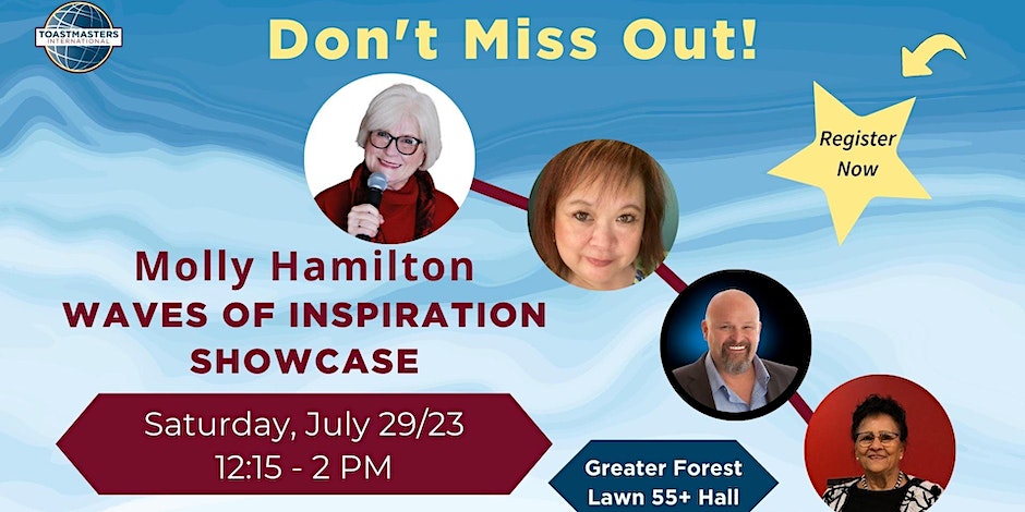 We are thrilled to invite you to the Waves of Inspiration Showcase supporting our D42 International Speech Semi-Finalist, Molly Hamilton. This event promises to be an unforgettable experience and will take place on Saturday, July 29 from 12:15 – 2:00 PM MDT at Forest Lawn 55+ Hall. Join us for an afternoon filled with captivating speeches delivered by: • Molly Hamilton, D42 2023 Toastmasters World Championship of Public Speaking (WCPS) contest Semi-Finalist and D21 2022 WCPS Finalist • Russ Dantu (DTM) D42 2015 WCPS Finalist • Rowena Romero (DTM) D42 2005 WCPS Finalist and 2002 WCPS Semi-Finalist and, • Kanak Khare (DTM) D42 2020 Champion. The Waves of Inspiration Showcase aims to create an engaging environment where you can personally interact with these renowned champions of public speaking. It is both a chance to show your support for Molly as she embarks on her journey to represent Toastmasters Region 4 – District 42 on the prestigious world stage in the Bahamas and an opportunity for you to be inspired yourself. Throughout the event, get ready to be moved by inspirational speeches that are sure to leave a lasting impact. Molly will deliver her remarkable 2023 Semi-Final speech “A Little Birdie Taught Me So”. In addition, the speakers will participate in a Q & A session regarding their journey to the World Stage. Finally, this gathering presents a wonderful chance to connect with fellow Toastmasters and truly appreciate the profound power of words. To help cover the costs associated with this exceptional event and show your support for Molly, we kindly request a contribution of $20 upon arrival. We cannot wait to have you join us at this transformative showcase! Molly Hamilton Waves of Inspiration Showcase Saturday, July 29, 2023 – 12:15 – 2 PM Greater Forest Lawn 55+ 3425 26 Avenue SE Calgary AB