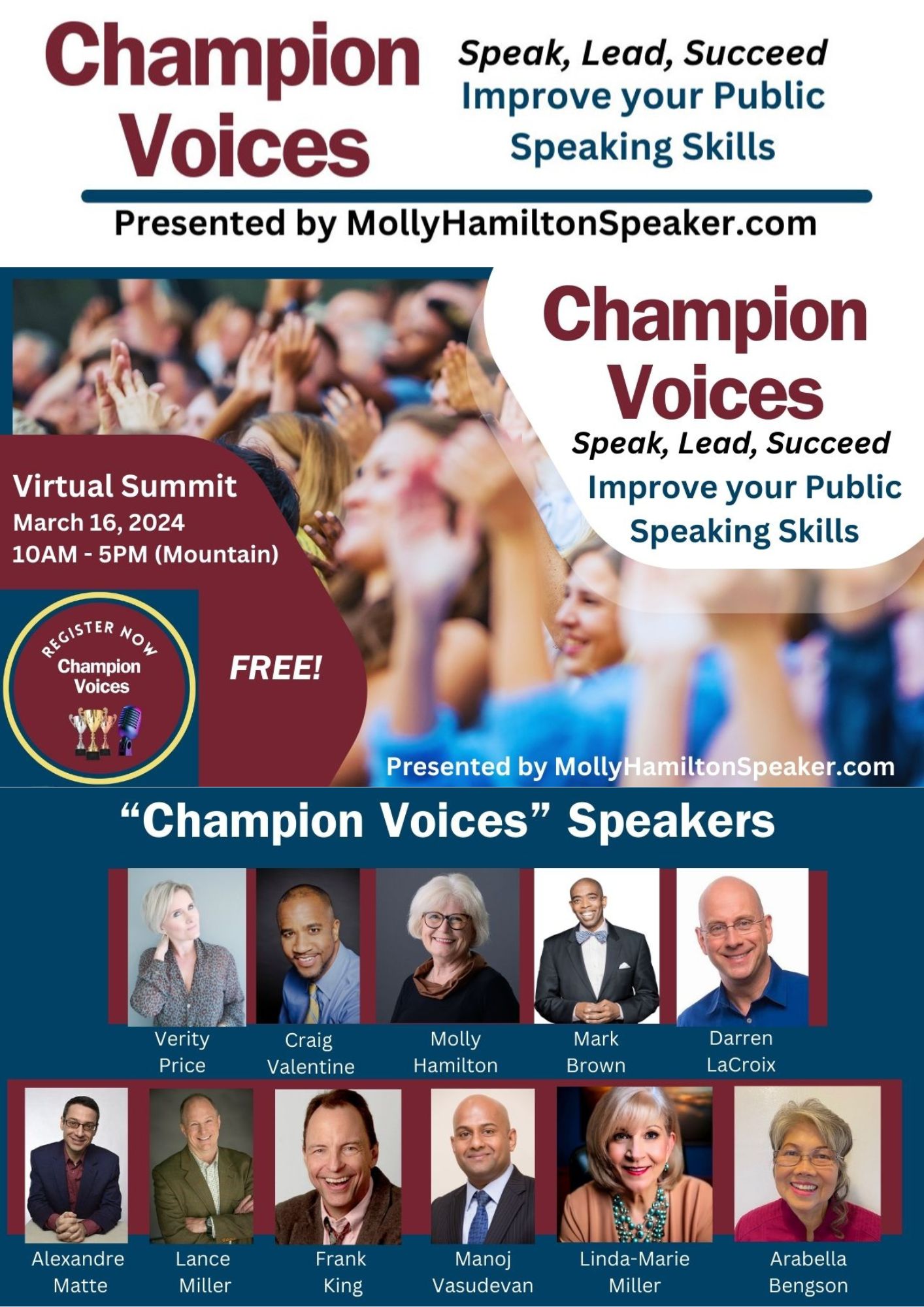 Don’t miss out on this unparalleled opportunity to unleash your potential, amplify your voice, and lead with confidence. Secure your virtual seat at the Champion Voices virtual summit today and embark on a transformative journey toward speaking excellent and success!