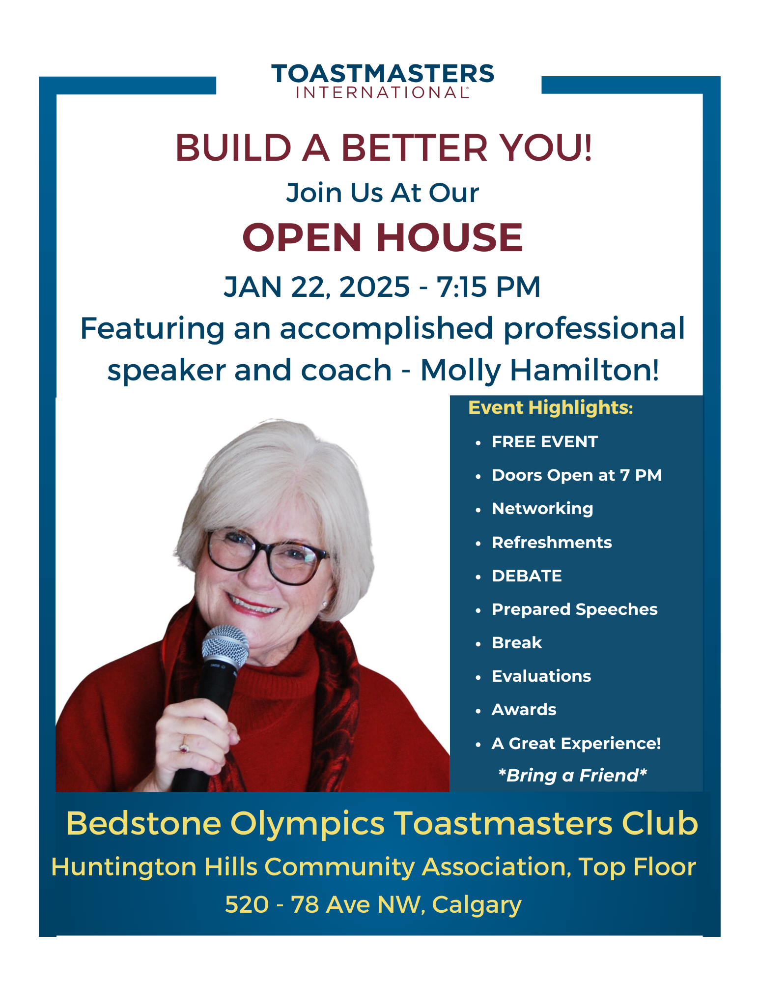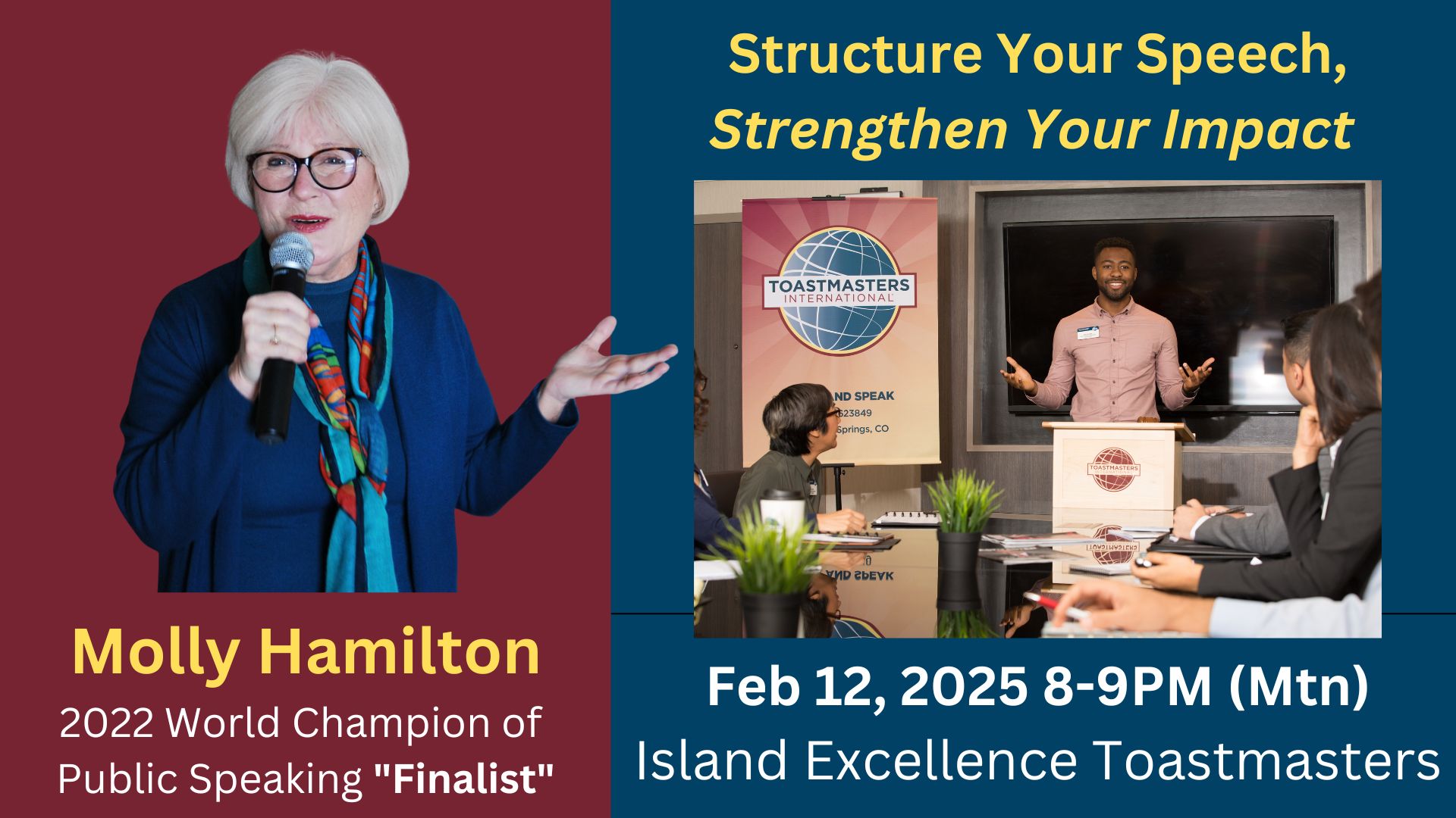 Unlock the secrets to delivering powerful speeches with confidence! Join us for an engaging workshop led by Molly Hamilton, a seasoned Toastmaster and World Championship finalist. In this interactive session, Molly will break down the essential components of a well-organized speech, focusing on how to capture your audience’s attention, communicate your message clearly, and leave a lasting impact. Plus, you’ll get a chance to practice firsthand by participating in a dynamic Table Topics session, where you’ll collaborate with fellow members to co-create a speech on overcoming stage fright. Whether you’re preparing for a presentation or simply looking to improve your public speaking skills, this workshop is a must-attend.